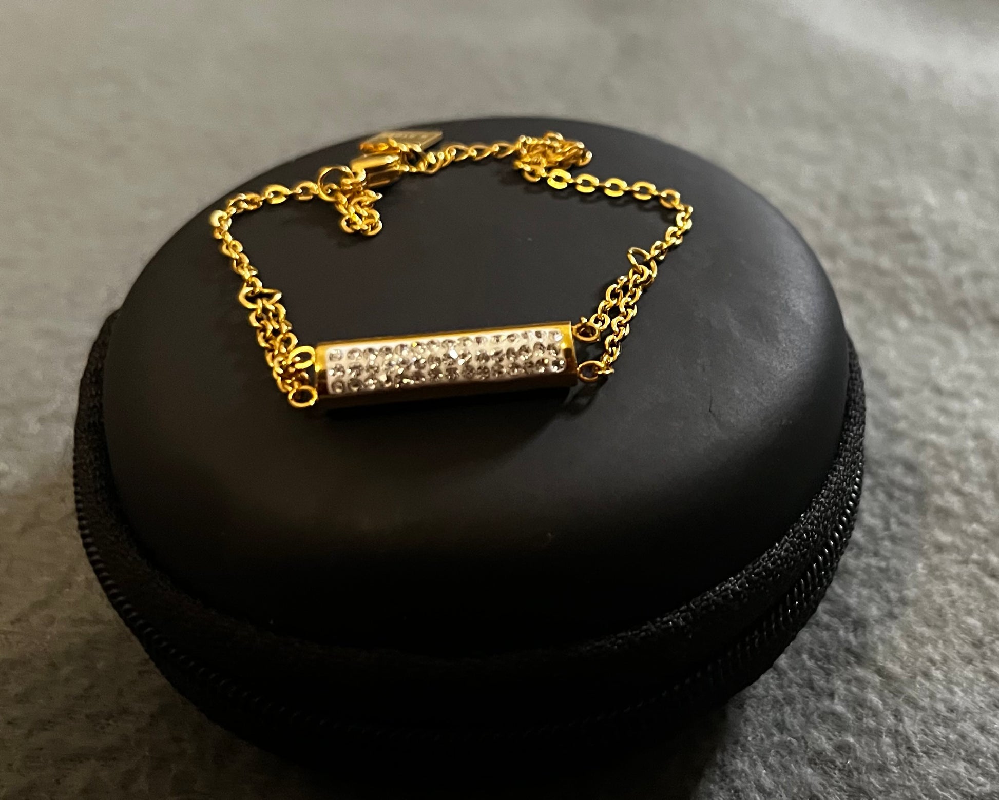 Sublimez votre poignet avec le Bracelet Élégance Dorée, une pièce raffiné qui allie modernité et intemporalité. Son délicat chaînage doré met en valeur une barre scintillante sertie de pierres étincelantes, offrant un jeu de lumière subtil à chaque mouvement