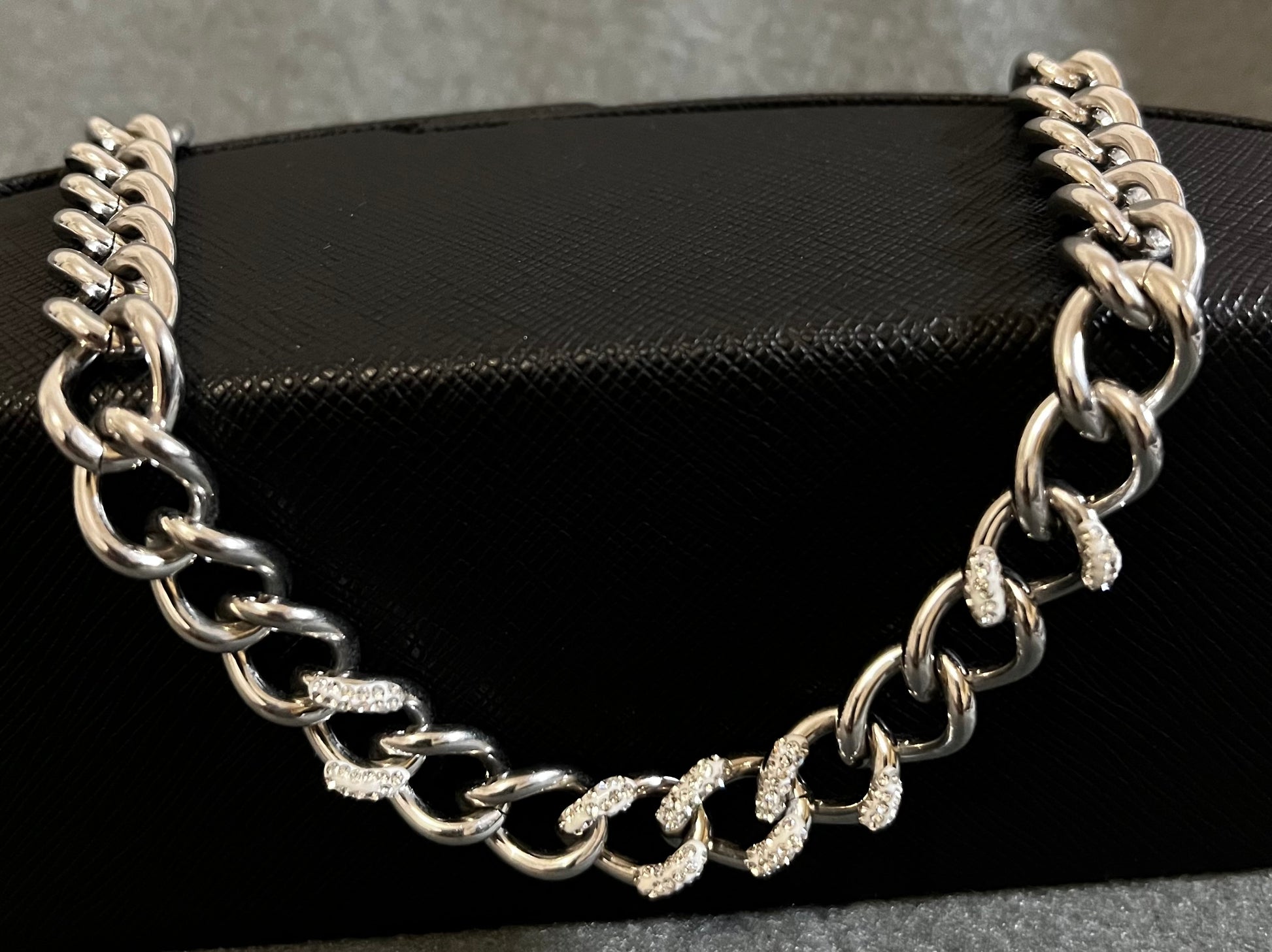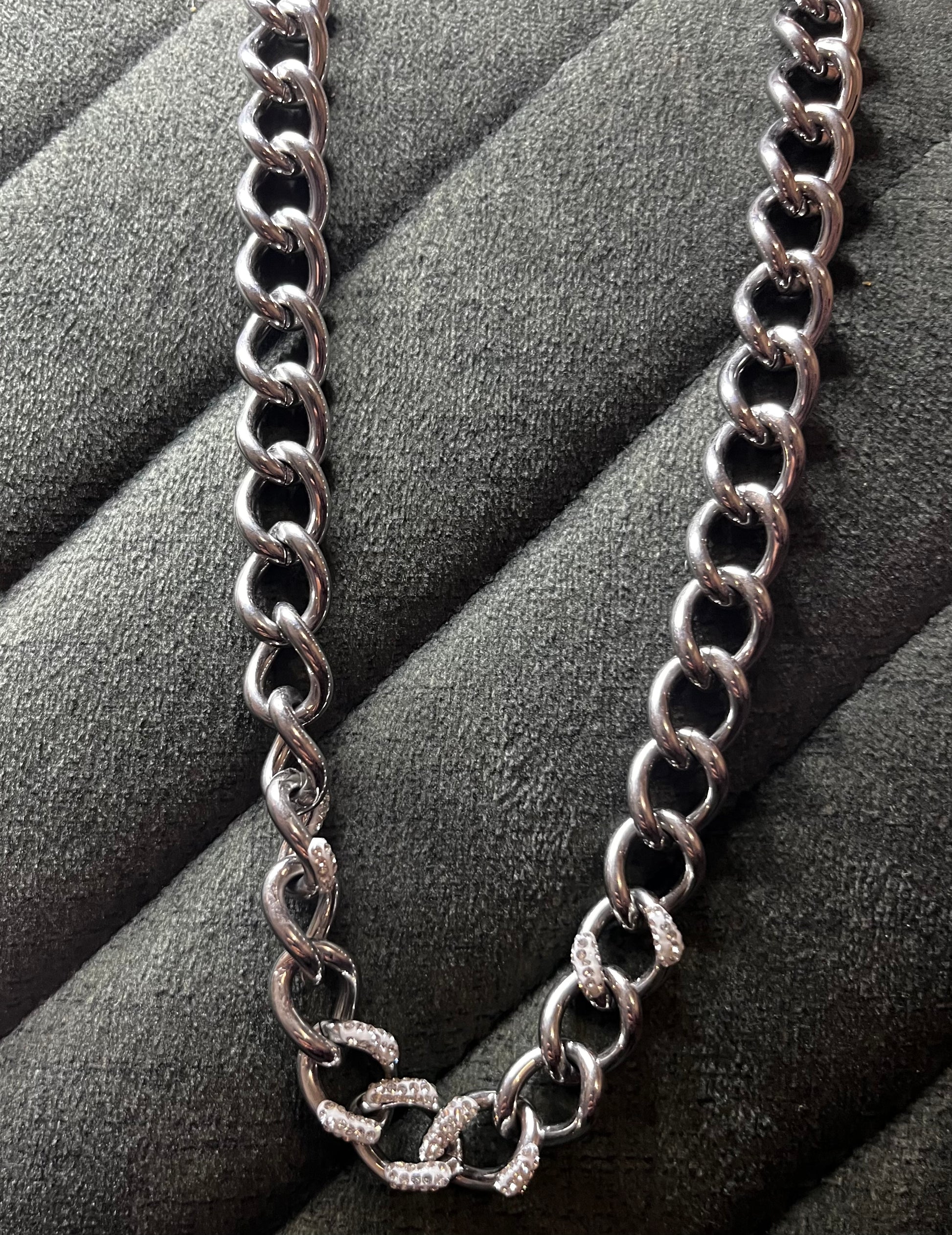Ses maillons alternent entre la puissance du métal poli et l’intensité des pierres scintillantes, offrant un design à la fois masculin et raffiné.